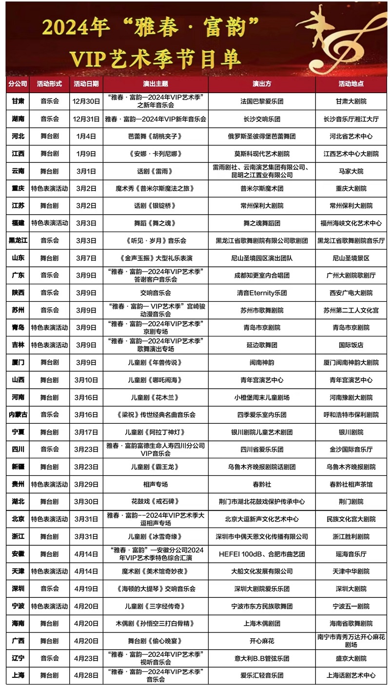 2024年三月,接續新春音樂會的慶典之聲,“雅春•富韻”VIP藝術季在全國各地盛情回歸,通過二十余場藝術盛宴邀請1.5萬余位尊貴客戶歡聚在融融春日,共賞話劇《雷雨》、京劇專場、多彩兒童劇、花鼓戲、交響音樂會等高端豐富的藝術演出,在包羅萬象的藝術文化碰撞中感受豐盈的生命之美。